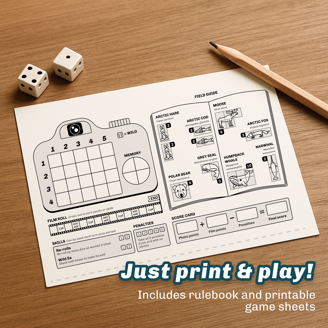 Film Crew: North Pole is an exciting print-and-play game that transforms you into a wildlife photographer exploring the Arctic! Roll dice, draw photos, and develop film to capture stunning wildlife moments in this unique strategy game. With its easy setup and engaging gameplay, Film Crew: North Pole is perfect for family game nights or casual fun with friends.