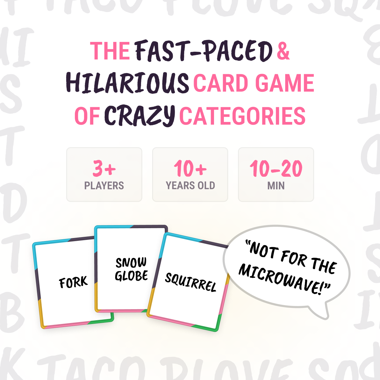 Holy Cactus Frog is a fast-paced and hilarious card game of crazy categories. In this chaotic, no-turns showdown, players race to find common threads between the words on their cards to create wild and wacky categories. Perfect for parties, family game nights, or anytime you want to let your imagination run wild. The weirder the better!
